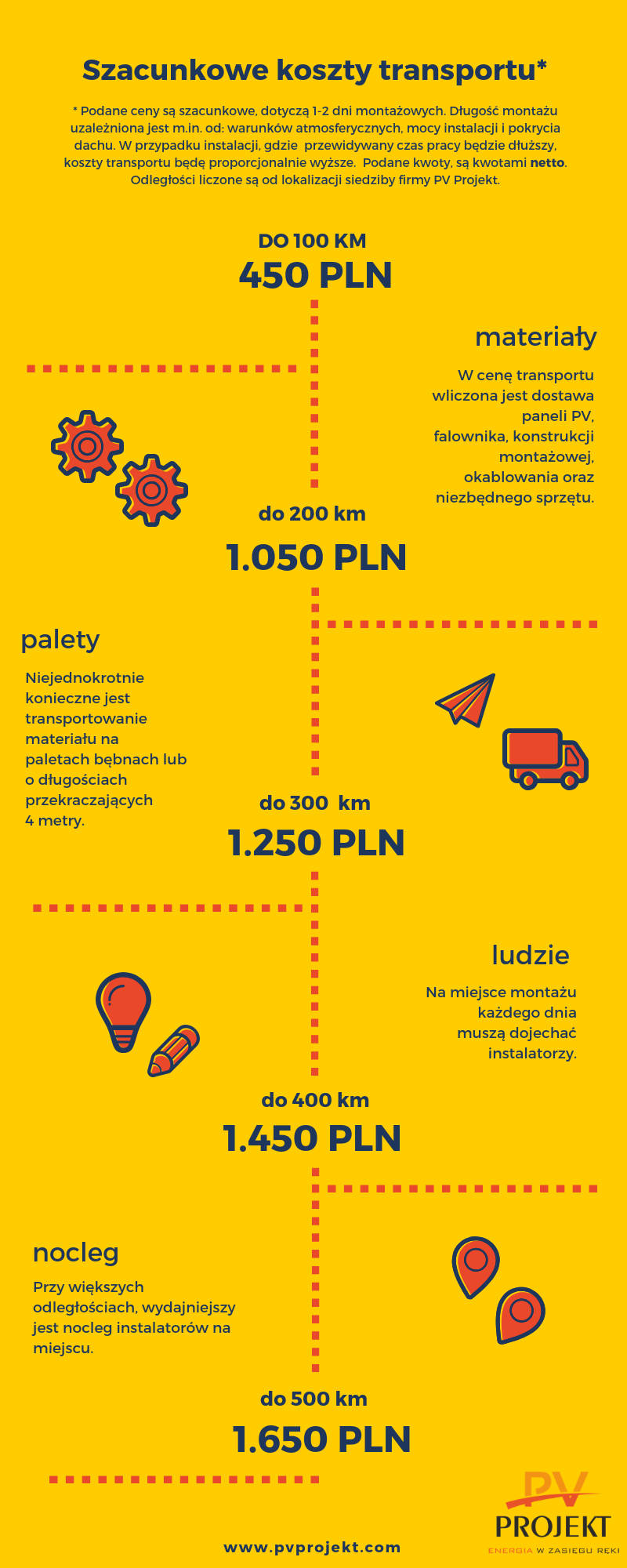 W związku z coraz liczniejszymi zapytaniami o wycenę instalacji fotowoltaicznych przychodzącymi do nas z całej Polski, przygotowaliśmy grafikę przedstawiającą szacunkowe koszty transportu, wraz z elementami, jakie obejmuje cena. Zapraszamy do zapoznania się, a w przypadku pytań jesteśmy do Państwa dyspozycji.